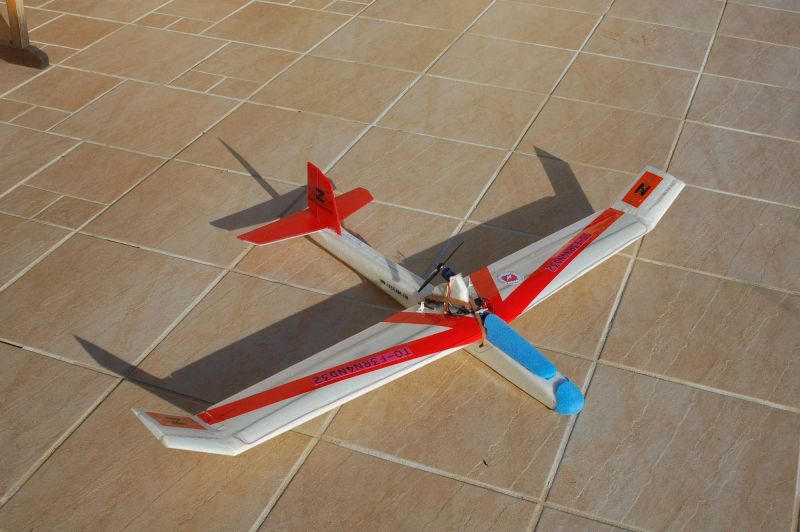 Le moteur est un speed 400 1.85/1 et l'hélice une 9x5. Les ailerons sont découpés dans l'epp et animées par 2 petits servos (ça permet d'activer les aérofreins). L'option ailerons proposée par z système livre des gouvernes full span en balsa et propose l'installation d'un servo standard central, c'est moins cher ! De face il a une allure plus racée qu'à l'origine. Les winglets sont facultatifs mais donnent un chouette look ! L'accu est situé sous l'aile, ce qui permet d'en utiliser plusieurs types sans modifier le centrage. (ici un 7 éléments 1000 nimh) |